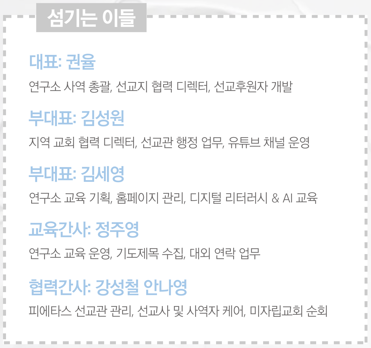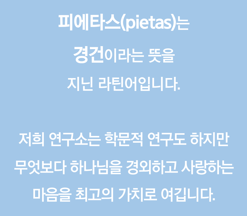 Pietas Missions Support Institute피에타스 선교지원연구소(해설)Pietas는 라틴어로 ‘경건’이라는 뜻입니다. 즉, 하나님을 사랑하고 경외하는 마음인데 본 연구소가 추구하는 최고의 가치입니다.Missions는 선교와 사역을 동시에 의미할 수 있습니다. 단수가 아닌 복수로 표현한 이유는 본 연구소가 감당하는 사역들이 많기 때문입니다.Support라고 표현한 이유는 기존의 사역들이 더 원활하게 진행되도록 선교(또는 사역)를 ‘지원’하기 때문입니다.Support Institute이기 때문에 Research Institute 개념의 연구소가 아닙니다. 명칭 그대로 선교(또는 사역) 지원을 연구하는 기관입니다. 정리하자면, 경건을 최고의 덕목으로 여기며 기존의 사역들이 더 원활해..